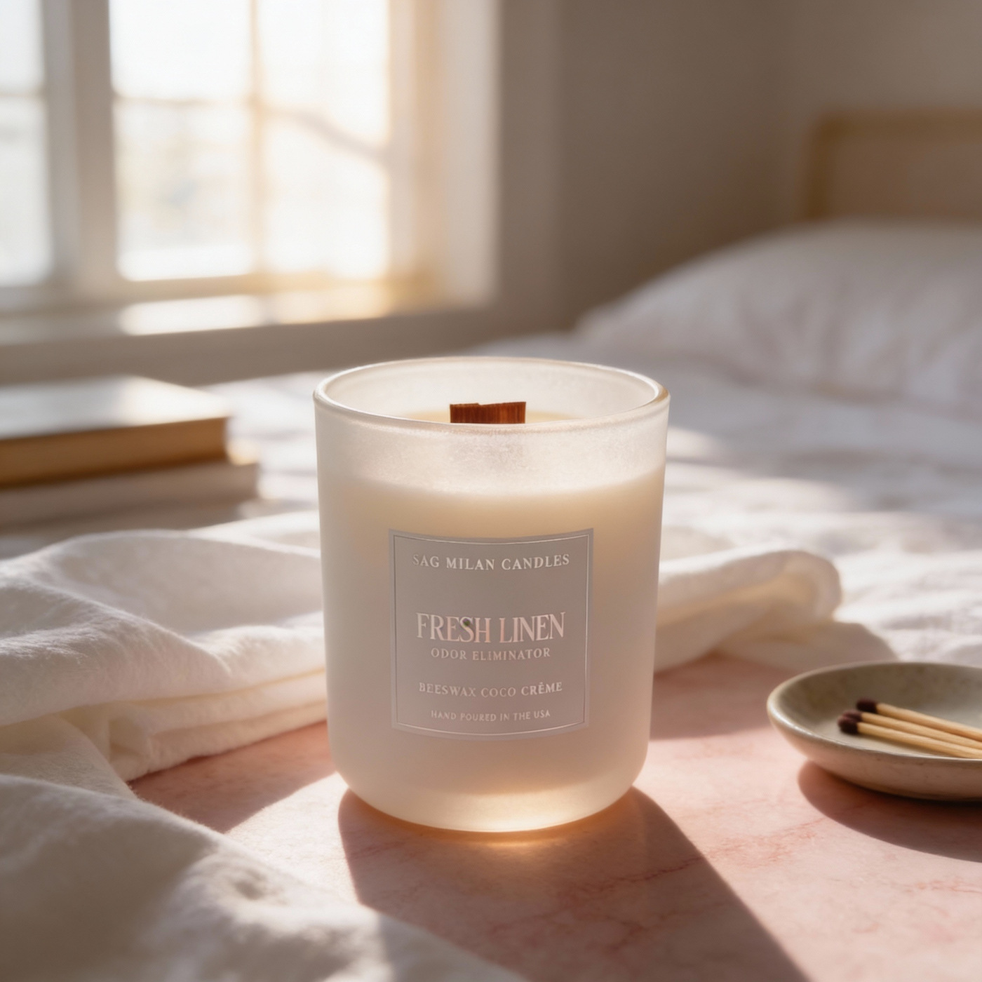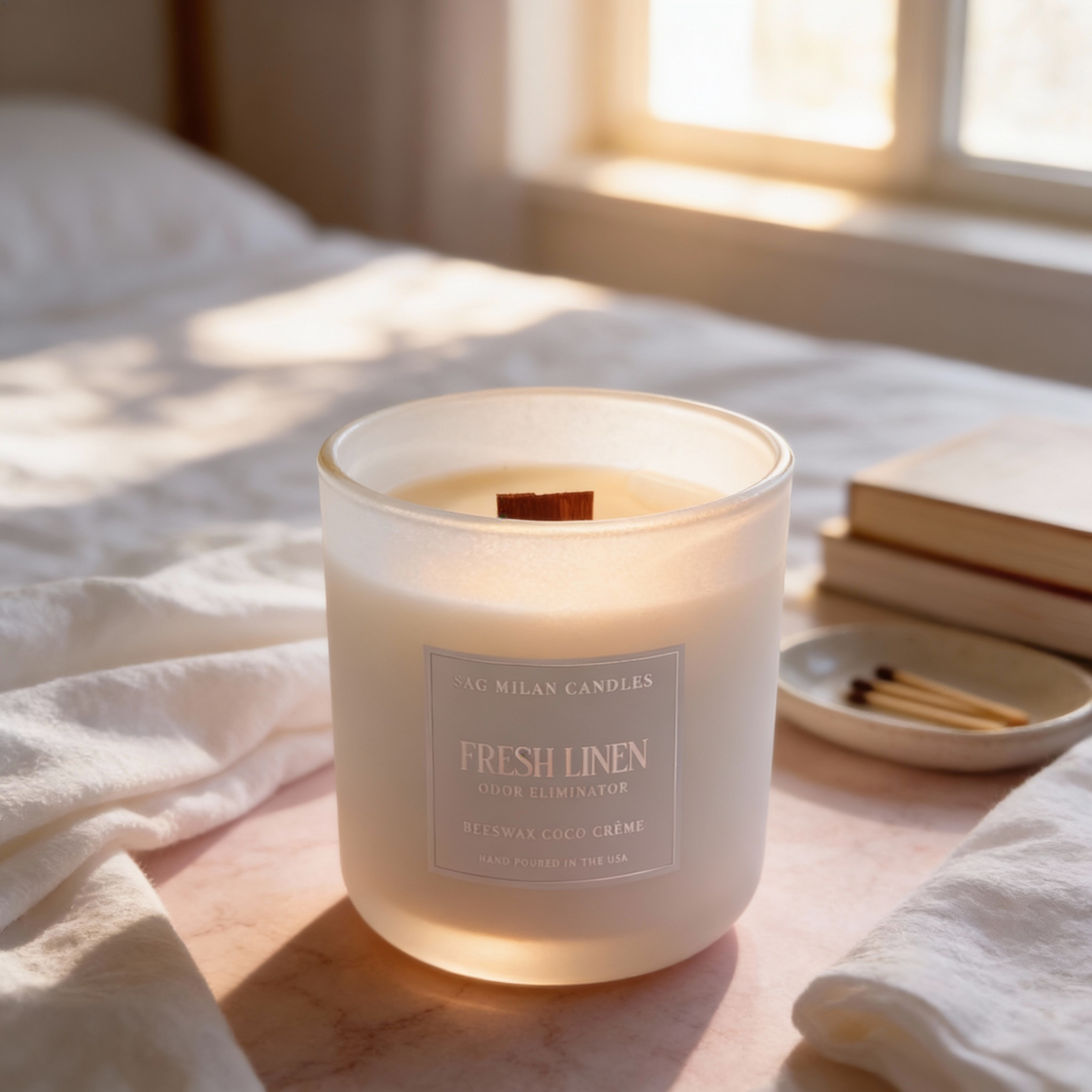 Wrap your space in the crisp, comforting scent of freshly laundered linen. Hand-poured in the USA, this Beeswax Coco Crème blend candle neutralizes unwanted odors instead of masking them, leaving the air delicately clean and calm. The wooden wick crackles softly as it burns, filling your home with an effortless, luxurious freshness — the essence of a just-washed breeze.
